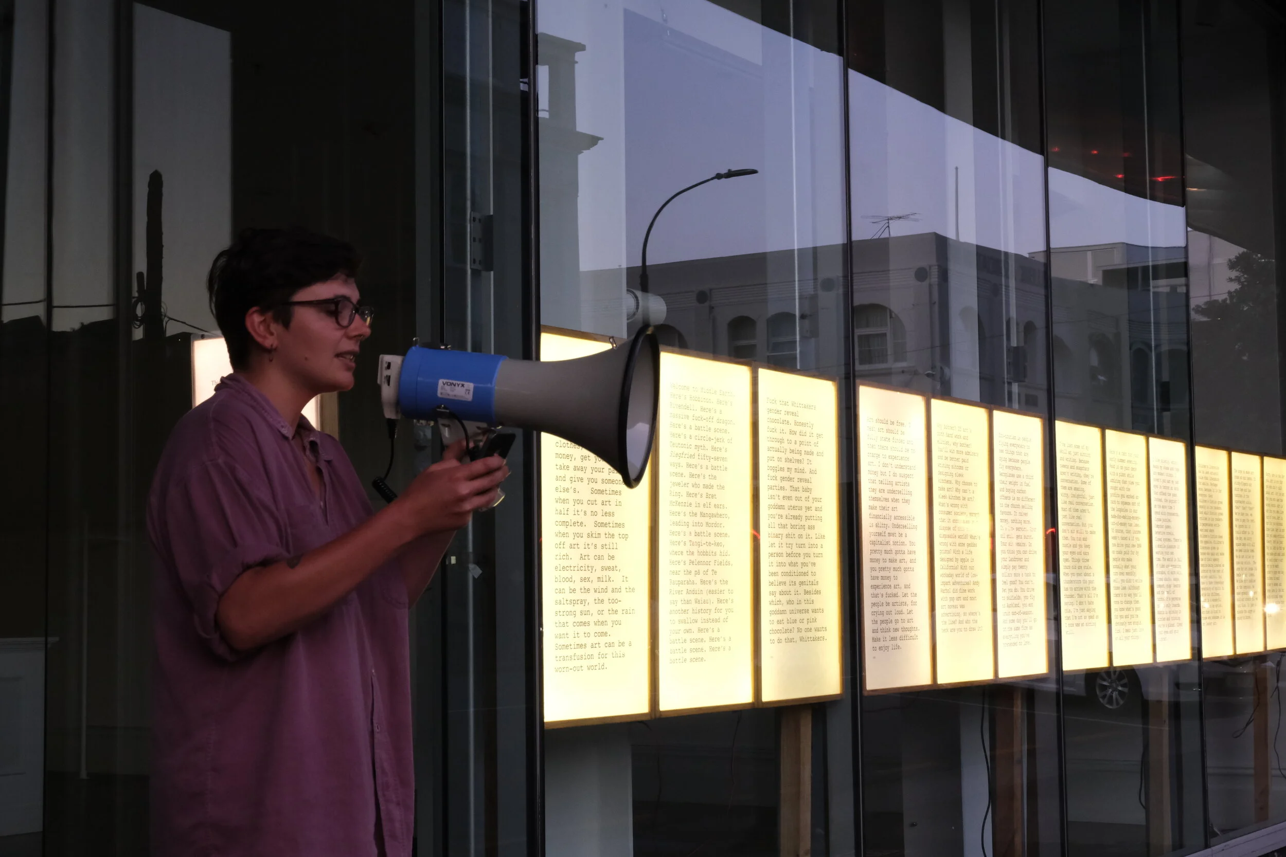 Over the period of its installation some of the writers performed the works via megaphone to passersby and traffic, bringing new citizen ideas to the street.