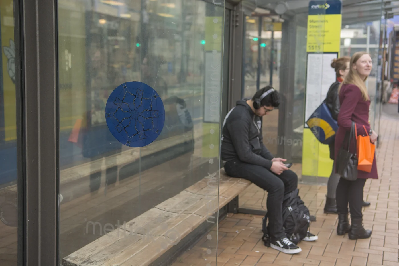 Adhesive photographic kaleidoscope patterns on bus shelters