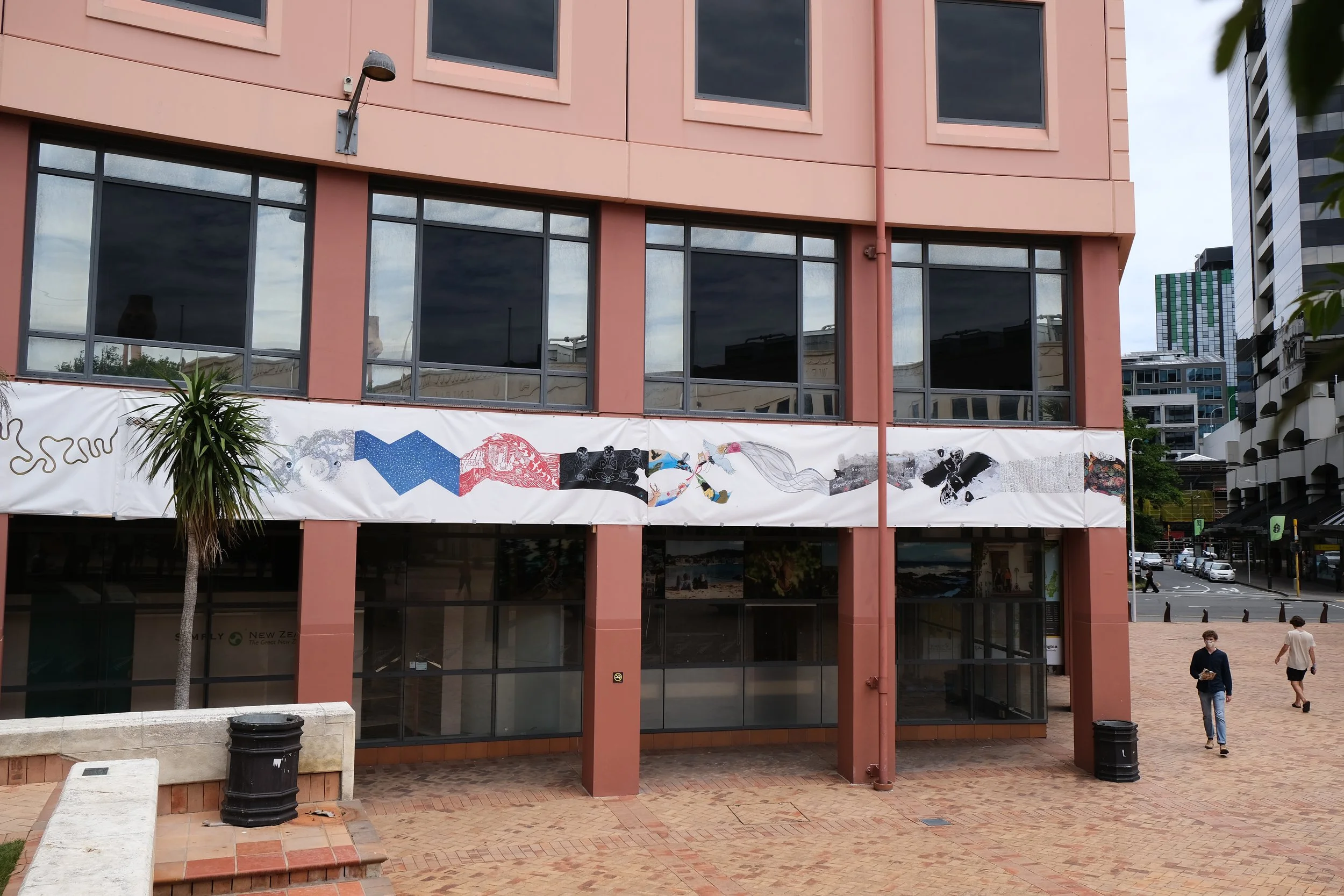 A 72-metre banner has been installed in Te Ngākau Civic Square - flowing long like an awa across the outside of vacant civic buildings - the work of 60 artists from around the nation in response to the isolation experienced during Covid lockdown. This work was first shown in Cathedral Square Christchurch.