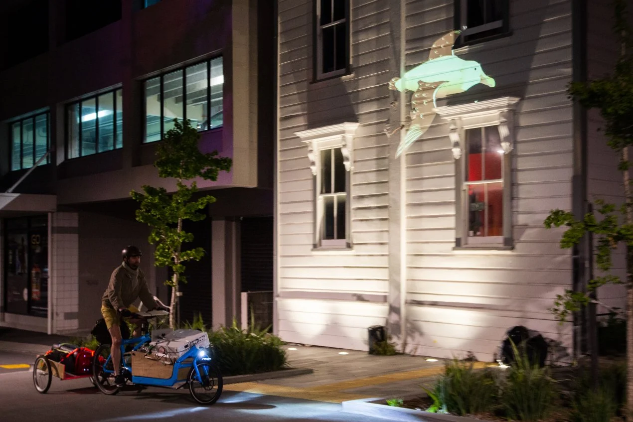 “A cargo bicycle rolls through inner-city Wellington, two large projectors mounted on it, mapping onto passing buildings, synched to a composed soundtrack, creating a huge swelling pulse of music and animation centred around the passing bike.”